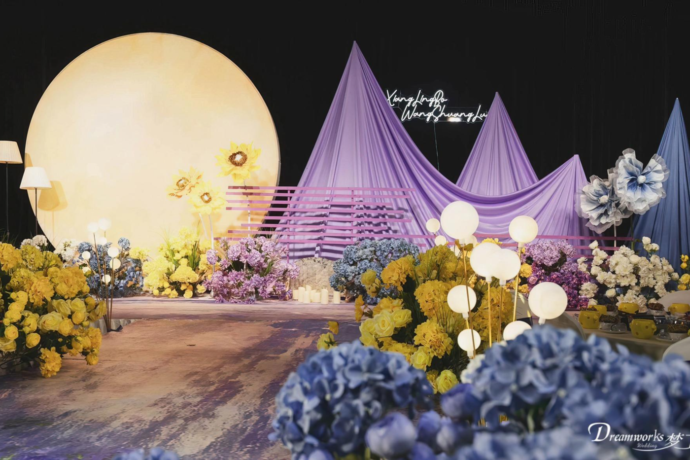 这场婚礼以 紫色为主色调,神秘而浪漫, 多巴胺风格的花艺点缀着婚礼现场,如同他们之间热烈而奔放的爱意。 舞台中央的太阳 闪耀着金色的光芒,象征着他们爱情的永恒和活力。[更多…]