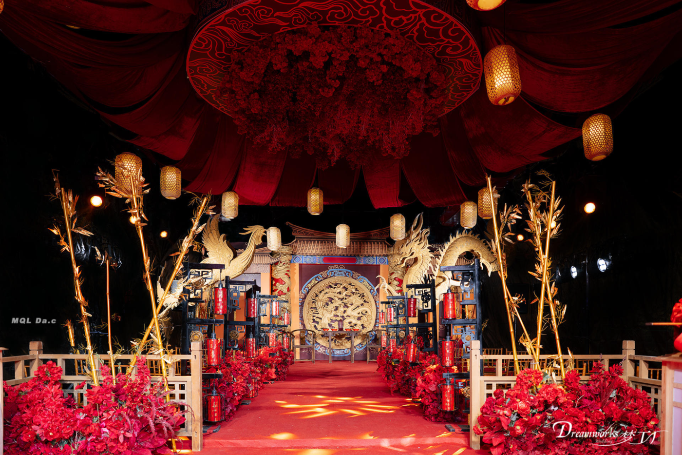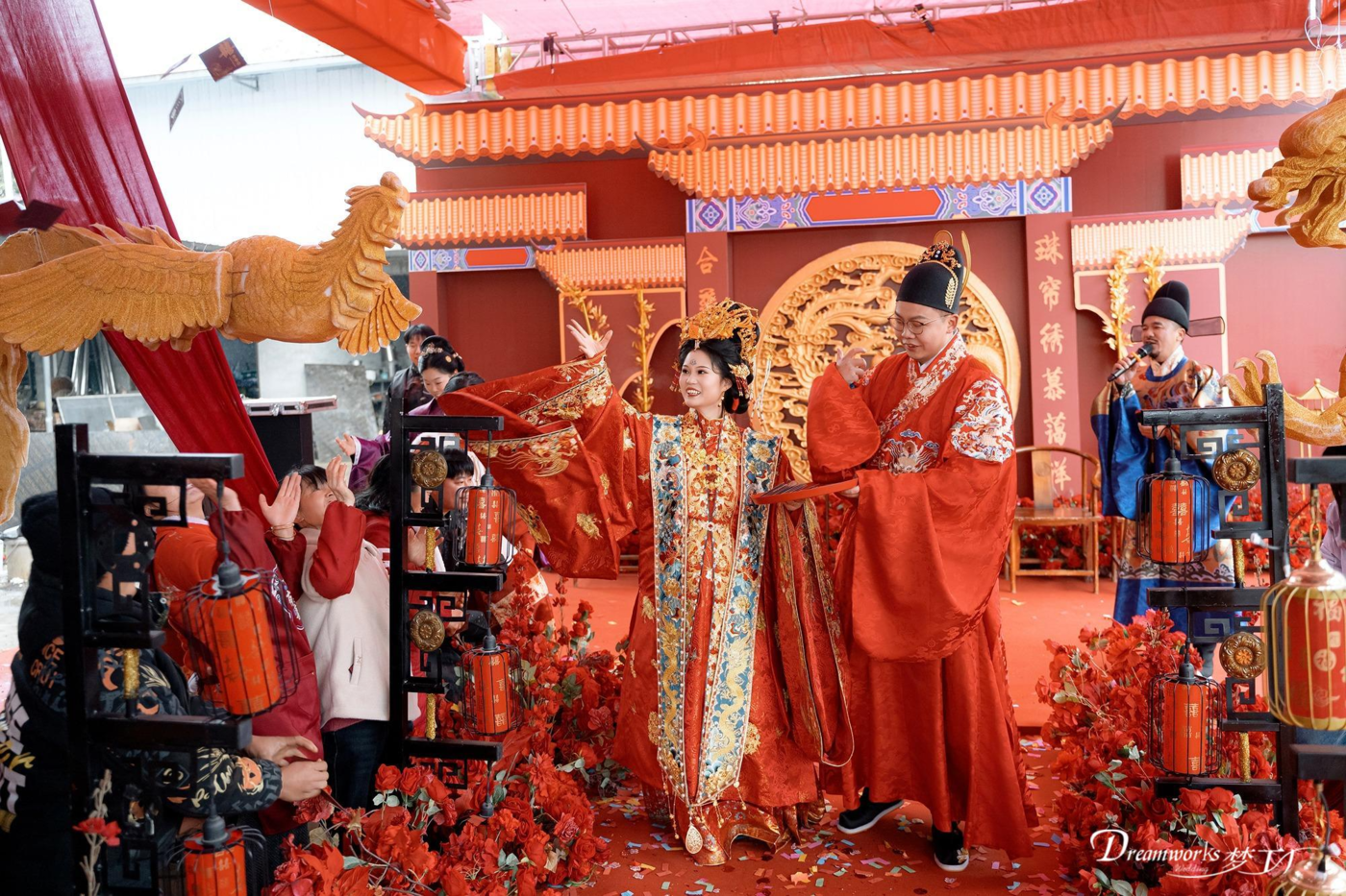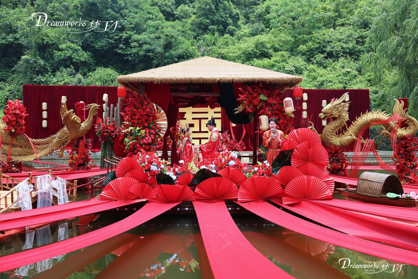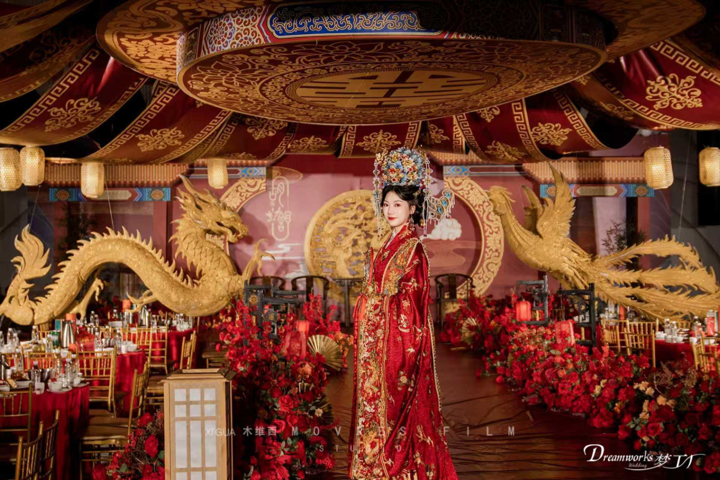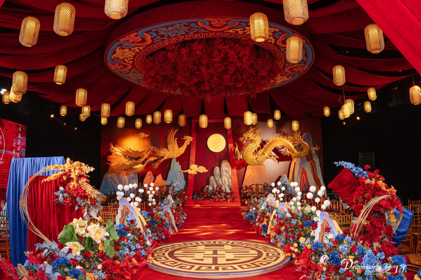 以华夏千年「山岳之稳,龙凤之仪」为魂,取朱砂红与靛青蓝为韵, 绘就一幅新中式婚典长卷,红是凤羽铺就的十里妆台,蓝是龙鳞拓印的星河天幕,而绵延的山峦,是沉默却永恒的誓言载体[更多…]